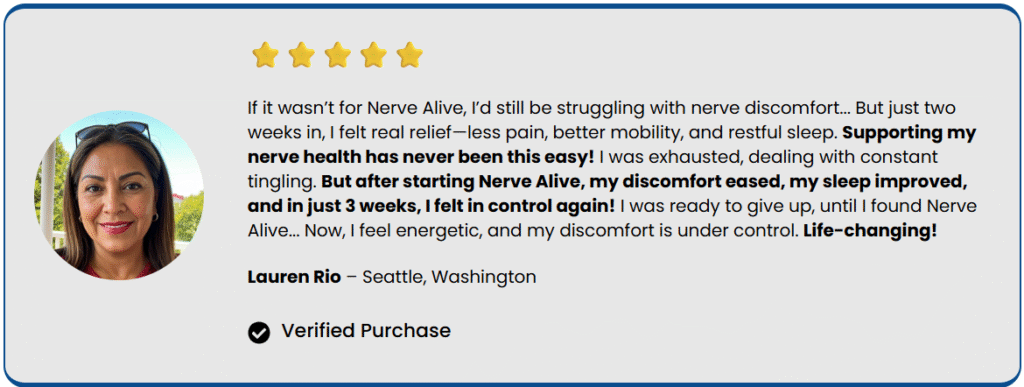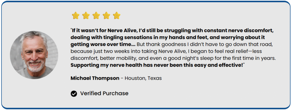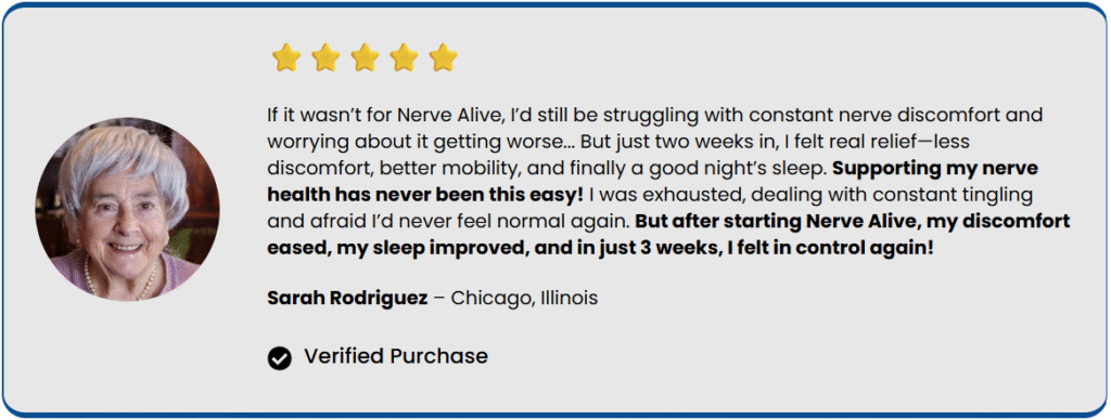 “If it wasn’t for Nerve Alive, I’d still be struggling with constant nerve discomfort, dealing with tingling sensations in my hands and feet, and worrying about it getting worse over time… But thank goodness I didn’t have to go down that road, because just two weeks into taking Nerve Alive, I began to feel real relief—less discomfort, better mobility, and even a good night’s sleep for the first time in years. Supporting my nerve health has never been this easy and effective!”